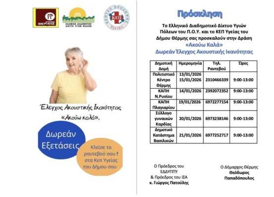 Το ΚΕ.Π. Υγείας του Δήμου Θέρμης, σε συνεργασία με το Ελληνικό Διαδημοτικό Δίκτυο Υγιών Πόλεων (ΕΔΔΥΠΠΥ), θα πραγματοποιήσει δωρεάν έλεγχο ακουστικής ικανότητας, στις εξής Κοινότητες