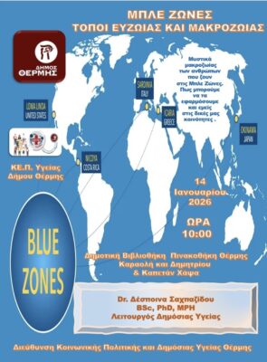 Το ΚΕΠ Υγείας του Δήμου Θέρμης διοργανώνει εκδήλωση με θέμα: «Μπλε Ζώνες, Τόποι Ευζωίας και Μακροζωίας», η οποία θα πραγματοποιηθεί την Τετάρτη 14 Ιανουαρίου 2026