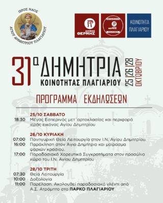 Παραδοσιακά χορευτικά σύνολα, παραδοσιακό γλέντι, καθώς και το καθιερωμένο μοίρασμα ψαριών και κρασιού, περιλαμβάνουν μεταξύ άλλων τα «31α Δημήτρια», ένα τετραήμερο θρησκευτικών και πολιτιστικών εκδηλώσεων, που διοργανώνονται από την Κοινότητα Πλαγιαρίου, από το Σάββατο 25 Οκτωβρίου έως τη Τρίτη 28 Οκτωβρίου. Οι εκδηλώσεις συνδυάζουν αρμονικά τον πολιτισμό και τη θρησκευτική παράδοση και πραγματοποιούνται με αφορμή τη γιορτή του Πολιούχου του Πλαγιαρίου Αγίου Δημητρίου.