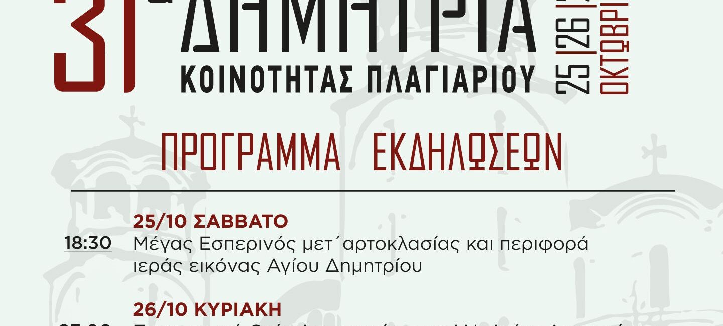 Παραδοσιακά χορευτικά σύνολα, παραδοσιακό γλέντι, καθώς και το καθιερωμένο μοίρασμα ψαριών και κρασιού, περιλαμβάνουν μεταξύ άλλων τα «31α Δημήτρια», ένα τετραήμερο θρησκευτικών και πολιτιστικών εκδηλώσεων, που διοργανώνονται από την Κοινότητα Πλαγιαρίου, από το Σάββατο 25 Οκτωβρίου έως τη Τρίτη 28 Οκτωβρίου. Οι εκδηλώσεις συνδυάζουν αρμονικά τον πολιτισμό και τη θρησκευτική παράδοση και πραγματοποιούνται με αφορμή τη γιορτή του Πολιούχου του Πλαγιαρίου Αγίου Δημητρίου.