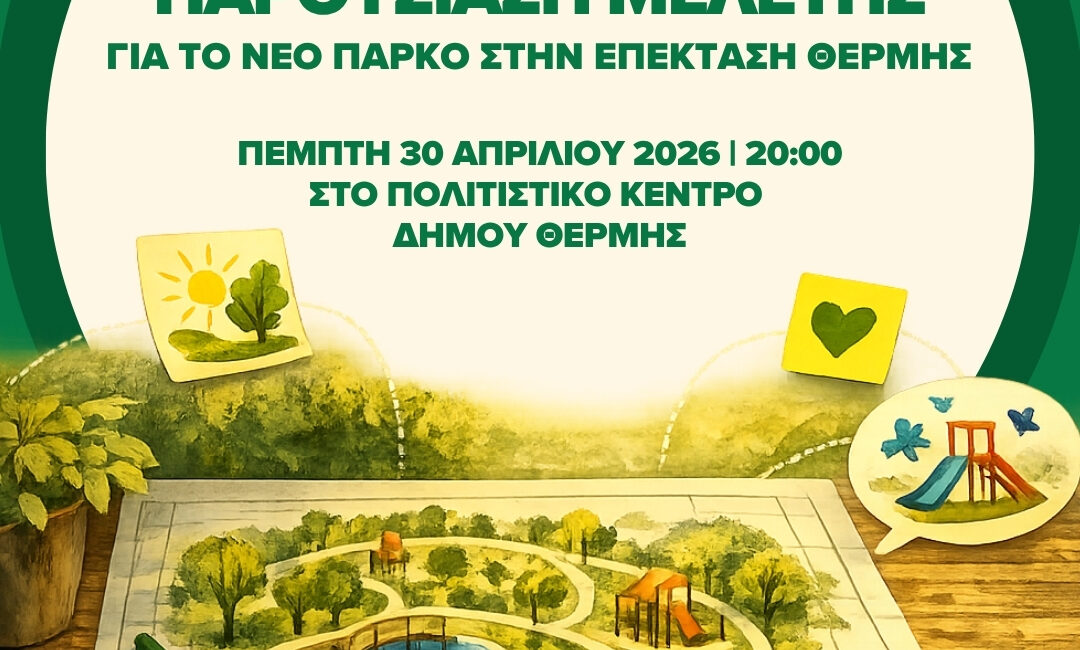 Ο Δήμος Θέρμης, σε συνεργασία με την περιβαλλοντική οργάνωση Μαμαγαία και την Homeotech, προσκαλούν τους πολίτες σε ανοιχτή συνάντηση για την παρουσίαση της μελέτης του νέου πάρκου στην Επέκταση Θέρμης, στην οδό Μαρία Κάλλας. Η εκδήλωση θα πραγματοποιηθεί την Πέμπτη 30 Απριλίου, στις 20:00, στη Βιβλιοθήκη του Πολιτιστικού Κέντρου Θέρμης, με ελεύθερη είσοδο για το κοινό. Η συνάντηση εντάσσεται στο πλαίσιο του έργου UCare και αποτελεί το επόμενο βήμα μιας συμμετοχικής διαδικασίας σχεδιασμού, που έχει ήδη ενεργοποιήσει τους κατοίκους της περιοχής.