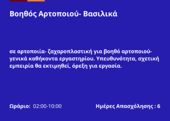 ... Περισσότερα 180326-Βοηθός Αρτοποιού- Βασιλικά. Νέα Αγγελία Γραφείου Απασχόλησης