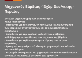 Μηχανικός Βάρδιας -13χλμ Θεσ/νικης – Περαίας. Νέα Αγγελία Γραφείου Απασχόλησης.