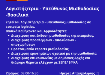 ... Περισσότερα 280126-Λογιστής/τρια – Υπεύθυνος Μισθοδοσίας -Βασιλικά.Νέα Αγγελία Γραφείου Απασχόλησης.