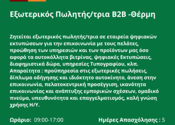 211025-Εξωτερικός Πωλητής/τρια Β2Β -Θέρμη. Νέα Αγγελία Γραφείου Απασχόλησης.