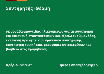 ... Περισσότερα 270625-Συντηρητής -Θέρμη. Νέα Αγγελία Γραφείου Απασχόλησης.