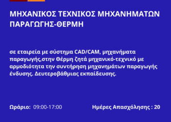 Μηχανικός Τεχνικός Μηχανημάτων Παραγωγής -Θέρμη Νέα Αγγέλια Γραφείου Απασχόλησης