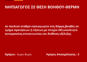 ... Περισσότερα Νηπιαγωγός σε θέση βοηθού -Θέρμη Νέα Αγγελία Γραφείου Απασχόλησης