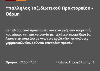 ... Περισσότερα 120126-Υπάλληλος Ταξιδιωτικού Πρακτορείου – Θέρμη. Νέα Αγγελία Γραφείου Απασχόλησης
