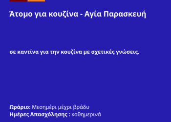 ... Περισσότερα 080426-Άτομο για κουζίνα – Αγία Παρασκευή. Νέα Αγγελία Γραφείου Απασχόλησης