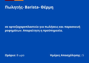 080426-Πωλητής- Barista- Θέρμη. Νέα Αγγελία Γραφείου Απασχόλησης