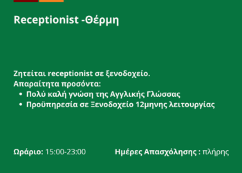 ... Περισσότερα 150426-Receptionist -Θέρμη. Νέα Αγγελία Γραφείου Απασχόλησης.