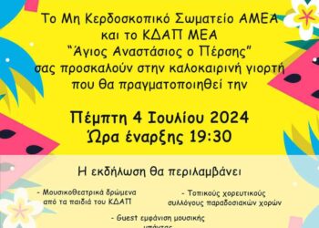 Καλοκαιρινή γιορτή θα πραγματοποιήσει τo μη κερδοσκοπικό... Περισσότερα Τρίλοφος: καλοκαιρινή γιορτή του ΚΔΑΠ μεΑ “Αγ. Αναστάσιος, ο Πέρσης” την Πέμπτη 4/7