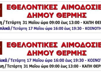 Δύο εθελοντικές αιμοδοσίες πρόκειται να διεξαχθούν τις... Περισσότερα Εθελοντική αιμοδοσία στις 17 και 31 Μαΐου σε Βασιλικά και Θέρμη