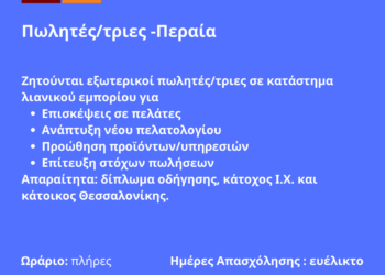 ... Περισσότερα 010426-Πωλητές/τριες -Περαία. Νέα Αγγελία Γραφείου Απασχόλησης.