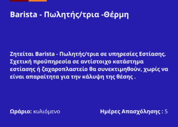 ... Περισσότερα 020426-Barista – Πωλητής/τρια -Θέρμη. Νέα Αγγελία Γραφείου Απασχόλησης.