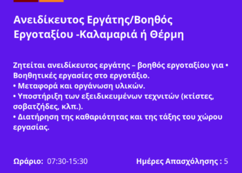 ... Περισσότερα 030426-Ανειδίκευτος Εργάτης/Βοηθός Εργοταξίου -Καλαμαριά ή Θέρμη. Νέα Αγγελία Γραφείου Απασχόλησης.