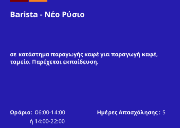 300426-Barista – Νέο Ρύσιο. Νέα Αγγελία Γραφείου Απασχόλησης