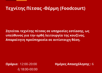 010925-Τεχνίτης Πίτσας -Θέρμη (Foodcourt). Νέα Αγγελία Γραφείου Απασχόλησης.