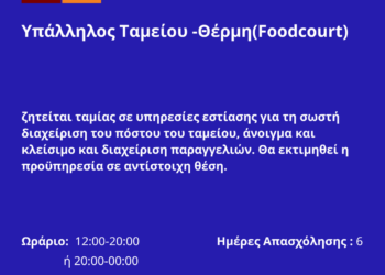 010925-Υπάλληλος Ταμείου -Θέρμη(Foodcourt). Νέα Αγγελία Γραφείου Απασχόλησης.