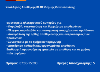 110825-Υπάλληλος Αποθήκης-ΒΙ.ΠΕ Θέρμης Θεσσαλονίκης. Νέα Αγγελία Γραφείου Απασχόλησης