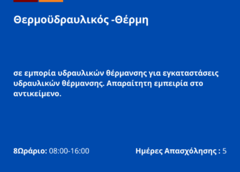 150725-Θερμοϋδραυλικός -Θέρμη. Νέα Αγγελία Γραφείου Απασχόλησης.