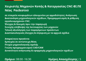 ... Περισσότερα Χειριστής Μηχανών Κοπής & Κατεργασίας CNC