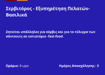 051125-Σερβιτόρος – Εξυπηρέτηση Πελατών- Βασιλικά. Νέα Αγγελία Γραφείου Απασχόλησης.