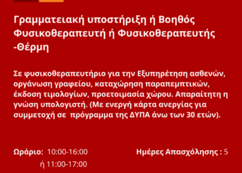 061125-Γραμματειακή υποστήριξη ή Bοηθός Φυσικοθεραπευτή ή Φυσικοθεραπευτής -Θέρμη. Νέα Αγγελία Γραφείου Απασχόλησης.