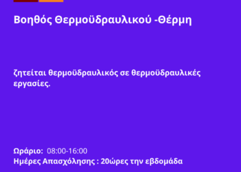... Περισσότερα 071125-Βοηθός Θερμοϋδραυλικού -Θέρμη. Νέα Αγγελία Γραφείου Απασχόλησης.