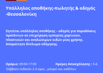 ... Περισσότερα 101125-Υπάλληλος αποθήκης-πωλητής & οδηγός -Θεσσαλονίκη. Νέα Αγγελία Γραφείου Απασχόλησης.