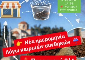 Λόγω των δυσμενών καιρικών συνθηκών, η προγραμματισμένη... Περισσότερα Μετάθεση ημερομηνίας της εκδήλωσης για την κομποστοποίηση, θα γίνει την Παρασκευή 3 Απριλίου