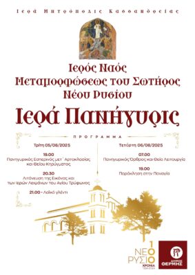 Με τη δέουσα λαμπρότητα αναμένεται να πραγματοποιηθεί ο φετινός εορτασμός για τη Μεταμόρφωση του Σωτήρος στη Κοινότητα του Νέου Ρυσίου, το διήμερο 5 και 6 Αυγούστου. Αναλυτικά οι εκδηλώσεις που θα διοργανωθούν προς τιμήν της Ιεράς Πανηγύρεως του Ιερού Ναού Μεταμορφώσεως του Σωτήρος έχουν ως εξής: