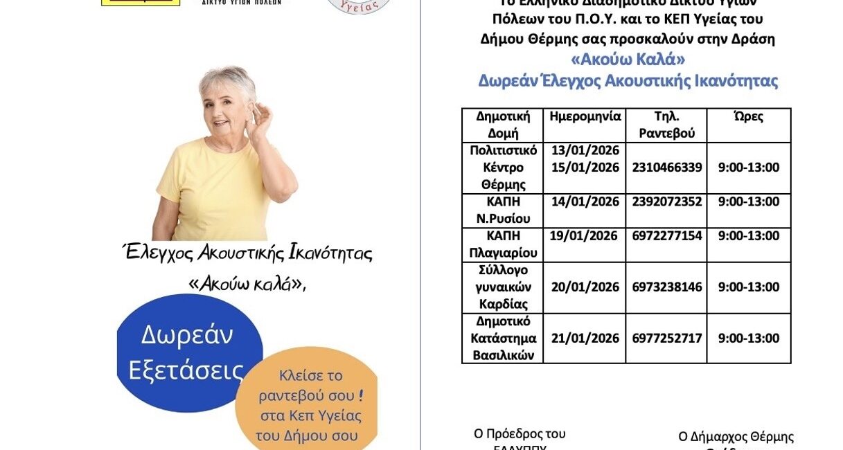Το ΚΕ.Π. Υγείας του Δήμου Θέρμης, σε συνεργασία με το Ελληνικό Διαδημοτικό Δίκτυο Υγιών Πόλεων (ΕΔΔΥΠΠΥ), θα πραγματοποιήσει δωρεάν έλεγχο ακουστικής ικανότητας, στις εξής Κοινότητες του Δήμου Θέρμης: