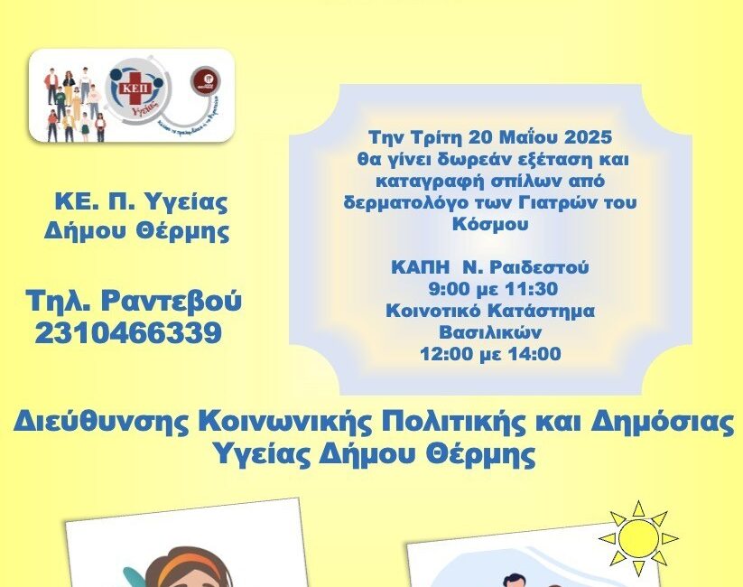 Δωρεάν καταγραφή και εξέταση σπίλων από δερματολόγο των Γιατρών του Κόσμου θα πραγματοποιηθεί την Τρίτη 20 Μαΐου, στο ΚΑΠΗ Νέας Ραιδεστού, από τις 09:00 έως τις 11:30 και στο Κοινοτικό κατάστημα Βασιλικών από τις 12:00 έως τις 14:00.