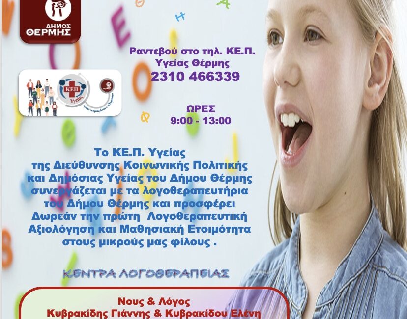 Το ΚΕ.Π. Υγείας της Διεύθυνσης Κοινωνικής Πολιτικής και Δημόσιας Υγείας του Δήμου Θέρμης, συνεργάζεται με τα Κέντρα Λογοθεραπείας του Δήμου Θέρμης και προσφέρει Δωρεάν την πρώτη Λογοθεραπευτική Αξιολόγηση και Μαθησιακή Ετοιμότητα στους μικρούς μας φίλους.