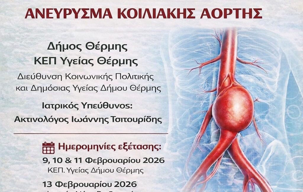 Δωρεάν προληπτικό έλεγχο για το Ανεύρυσμα Κοιλιακής Αορτής διοργανώνει το Κέντρο Πρόληψης Υγείας της Διεύθυνσης Κοινωνικής Πολιτικής και Δημόσιας Υγείας του Δήμου Θέρμης, σε συνεργασία με το Εθνικό Διαδημοτικό Δίκτυο Υγιών Πόλεων – Προαγωγής Υγείας (ΕΔΔΥΠΠΥ) και με τη συμμετοχή του εθελοντή ακτινοδιαγνώστη κ. Ιωάννη Τσιτουρίδη.