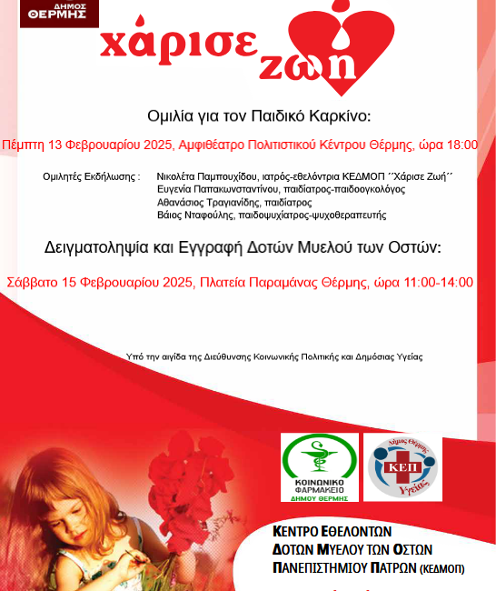 Το Κοινωνικό Φαρμακείο και το ΚΕΠ Υγείας του δήμου Θέρμης υπό τη Διεύθυνση της Κοινωνικής Πολιτικής και Δημόσιας Υγείας, σε συνεργασία με το ΚΕΔΜΟΠ- «Χάρισε Ζωή» (Κέντρο Εθελοντών Δοτών Μυελού των Οστών Πανεπιστημίου Πατρών) θα διοργανώσουν δράσεις για τη προσέλκυση εθελοντών μυελού των οστών. Συγκεκριμένα, την Πέμπτη 13 Φεβρουαρίου και ώρα 18:00 στο αμφιθέατρο του Πολιτιστικού Κέντρου Θέρμης θα πραγματοποιηθεί ομιλία για τον παιδικό καρκίνο. Ομιλητές θα είναι οι: Νικολέτα Παμπουχίδου, ιατρός-εθελόντρια του ΚΕΔΜΟΠ- «Χάρισε Ζωή», Ευγενία Παπακωνσταντίνου, παιδίατρος-παιδοογκολόγος, Αθανάσιος Τραγιανίδης, παιδίατρος και Βάιος Νταφούλης, παιδοψυχίατρος-ψυχοθεραπευτής.