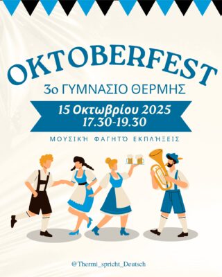 Το 3ο Γυμνάσιο Θέρμης σας προσκαλεί στις 15 Οκτωβρίου μεταξύ 5.30-7.30μμ σε μια εορταστική εκδήλωση με άρωμα Oktoberfest! Η γιορτή είναι ανοιχτή για όλους τους μαθητές/τις μαθήτριες, τις οικογένειες τους αλλά και την τοπική κοινωνία.
