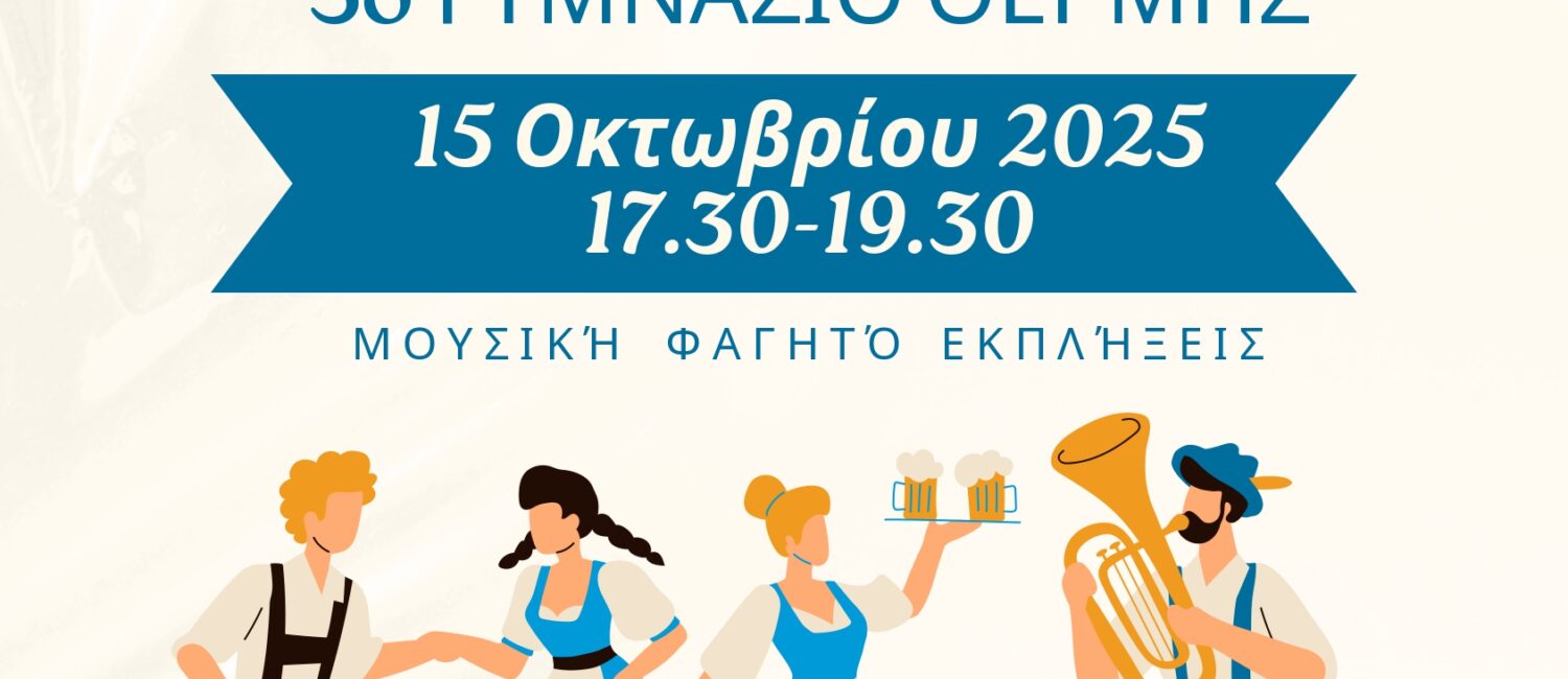 Το 3ο Γυμνάσιο Θέρμης σας προσκαλεί στις 15 Οκτωβρίου μεταξύ 5.30-7.30μμ σε μια εορταστική εκδήλωση με άρωμα Oktoberfest! Η γιορτή είναι ανοιχτή για όλους τους μαθητές/τις μαθήτριες, τις οικογένειες τους αλλά και την τοπική κοινωνία.