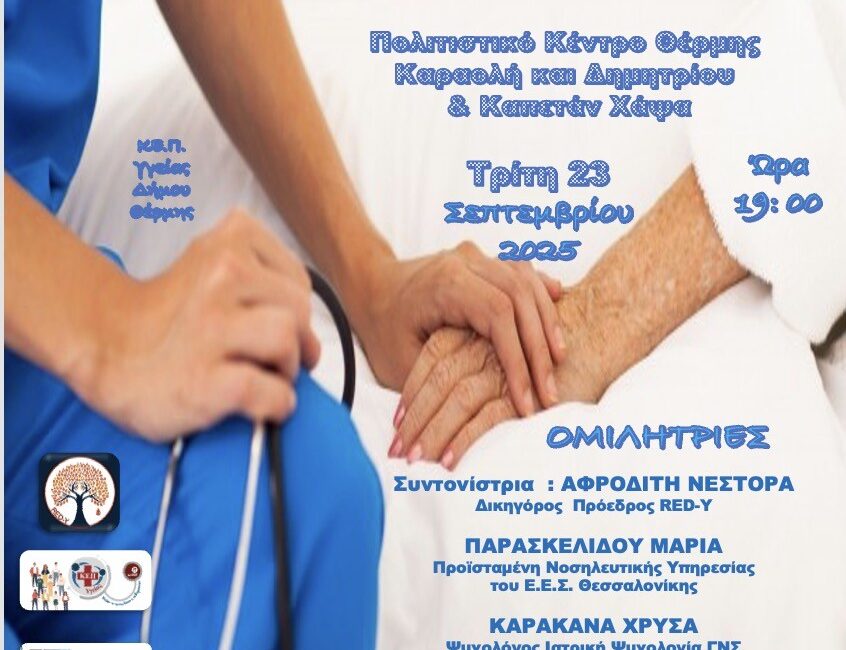 Mε στόχο την ανάδειξη του καθοριστικού ρόλου των φροντιστών στη φροντίδα και υποστήριξη ατόμων με χρόνιες παθήσεις, δίνοντας έμφαση στην αξία της πρόληψης, της ενδυνάμωσης και της ψυχοκοινωνικής υποστήριξης, το ΚΕ.Π. Υγείας του δήμου Θέρμης, σε συνεργασία με τον Ελληνικό Ερυθρό Σταυρό Θεσσαλονίκης, την Ελληνική Εταιρεία Νόσου Alzheimer και Συγγενών Διαταραχών και το Σωματείο RED-Y, και με την υποστήριξη του φορέα Εξελίσσω και το ΑΛΜΑ ΖΩΗΣ Θεσσαλονίκης, διοργανώνουν εκδήλωση με θέμα: «Η Σπουδαιότητα των Φροντιστών στην Αντιμετώπιση Χρόνιων Ασθενειών», την Τρίτη 23 Σεπτεμβρίου 2025, και ώρα 19:00, στο Πολιτιστικό Κέντρο Θέρμης (Καραολή και Δημητρίου & Καπετάν Χάψα).
