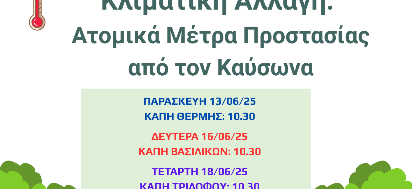 Στο πλαίσιο των δράσεων της Ευρωπαϊκής Αποστολής για την Προσαρμογή στην Κλιματική Αλλαγή, ο δήμος Θέρμης μέσω του Αυτοτελούς Τμήματος Ενεργειακού Σχεδιασμού & της Διεύθυνσης Κοινωνικής Πολιτικής & Δημόσιας Υγείας διοργανώνει σειρά ενημερωτικών εκδηλώσεων με θέμα: “Κ.Α.Π.Η. Ανθεκτικά στην Κλιματική Αλλαγή – Ατομικά Μέτρα Προστασίας από τον Καύσωνα”.