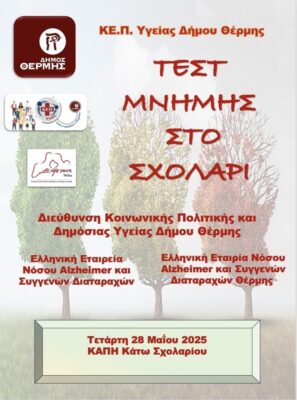 Το ΚΕ.Π. Υγείας του Δήμου Θέρμης, η Ελληνική Εταιρεία Νόσου Alzheimer και Συγγενών Διαταραχών Θέρμης σε συνεργασία με την Ελληνική Εταιρεία Νόσου Alzheimer και Συγγενών Διαταραχών, διοργανώνει