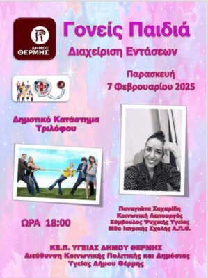 Το ΚΕ.Π. Υγείας του Δήμου Θέρμης,σε συνεργασία με την κ.Παναγιώτα Σαχαρίδη Κοινωνική Λειτουργός -Σύμβουλος Ψυχικής Υγείας Msc Ιατρικής Σχολής Α.Π.Θ, διοργανώνει ομιλία με θέμα: “Γονείς