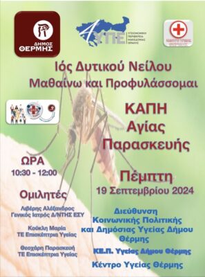 Το ΚΕΠ Υγείας Δήμου Θέρμης σε συνεργασία με το Κέντρο Υγείας Θέρμης, διοργανώνει ομιλία με θέμα:<<Ιός Δυτικού Νείλου Μαθαίνω και Προφυλάσσομαι>>. Η εκδήλωση θα πραγματοποιηθεί