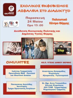 Το ΚΕ.Π. Υγείας του Δήμου Θέρμης διοργανώνει εκδήλωση με θέμα: «Σχολικός εκφοβισμός – Ασφάλεια στο Διαδίκτυο», την Παρασκευή 24 Μαΐου 2024 και ώρα 19:00, στο Πολιτιστικό