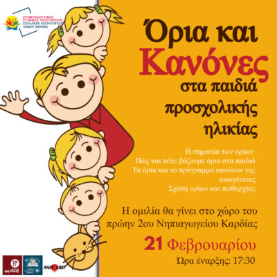 Την Τετάρτη, 21 Φεβρουαρίου, στις 17:30, στο χώρο του πρώην 2ου Νηπιαγωγείου Καρδίας θα πραγματοποιηθεί αλληλεπιδραστική συνάντηση – ομιλία με θέμα “Όρια και Κανόνες στα παιδιά προσχολικής ηλικίας”. Η