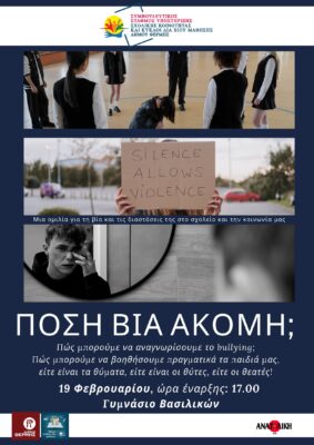 Τη Δευτέρα 19 Φεβρουαρίου, στις 17:00, στο Γυμνάσιο των Βασιλικών, θα πραγματοποιηθεί αλληλεπιδραστική συνάντηση – ομιλία με θέμα “Πόση Βία ακόμη;“. Tην διοργανώνουν η Διεύθυνση Παιδείας, Πολιτισμού και Αθλητισμού Δήμου Θέρμης