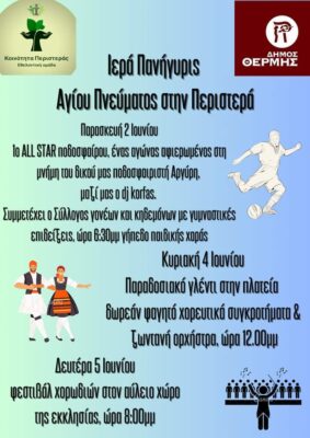 Πλήθος εκδηλώσεων περιλαμβάνει ο φετινός τριήμερος εορτασμός του Αγίου Πνεύματος στην Περιστερά. Το πλήρες πρόγραμμα έχει ως εξής: – Παρασκευή 2 Ιουνίου: 1ο ALL STAR Περιστεράς.