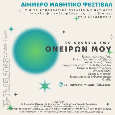 Με πρωτοβουλία της σχολικής κοινότητας (μαθητές/τριες, εκπαιδευτικοί, σύλλογοι γονέων και κηδεμόνων) διοργανώνεται το διήμερο μαθητικό Φεστιβάλ με θέμα «Το σχολείο των ονείρων μου: Τα Δημοκρατικά σχολεία